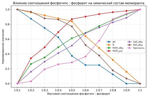 Показано, что изменение массового соотношения компонентов существенно влияет на химический состав и физико-механические свойства полученных гранулированных материалов. Установлено, что увеличение содержания фосфорита приводит к росту содержания общего и усвояемого P₂O₅, а также способствует формированию более прочной гранулированной структуры. Введение глауконита обеспечивает дополнительное обогащение продукта калием, магнием и кремнием, что повышает агрохимическую ценность мелиоранта.