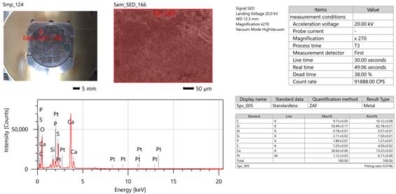 EDS-анализ подтверждает присутствие элементов Ca, O, P, Si и C, что свидетельствует о формировании органоминеральной системы.