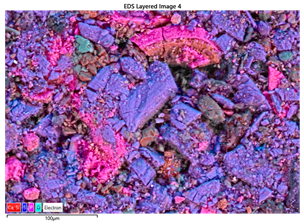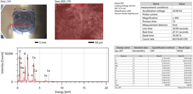 EDS-анализ показывает присутствие Ca, Si, Fe, Mg и P, что связано с минеральным составом сапропеля.