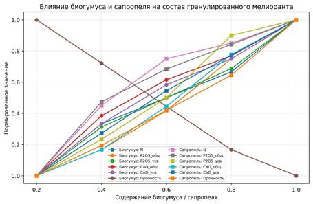 Результаты показывают, что использование биогумуса способствует увеличению содержания доступного фосфора, тогда как применение сапропеля приводит к значительному повышению прочности гранул.