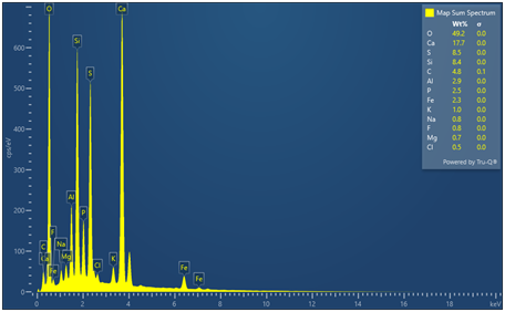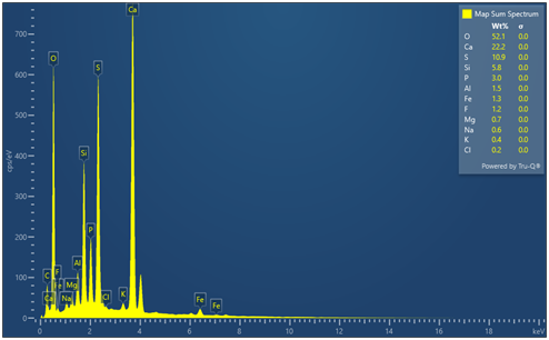 Результаты EDS-анализа подтвердили присутствие основных элементов (Ca, S, Si, P, Fe, Al, Mg и K), характерных для исследуемых минеральных систем. Данные рентгенофазового анализа (XRD) свидетельствуют о наличии основных кристаллических фаз, включая гипс, фосфатные соединения кальция и кварц.