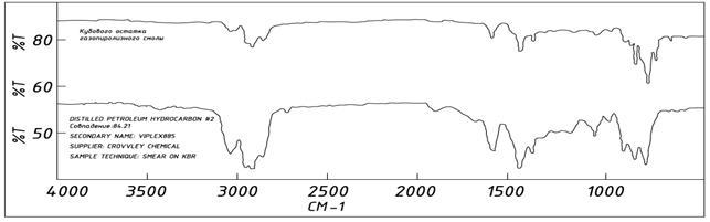 Подвергли термической обработке смолу тар-продуктом, образующемся в процессе пиролиза газа технологического процесса производства пропилена при температуре 200–220 °C. В результате образовалось черное жидкое вещество с молекулярной массой 1000–1100. Его количество уменьшилось до 45 %, изучены ИКС (рис. 2).