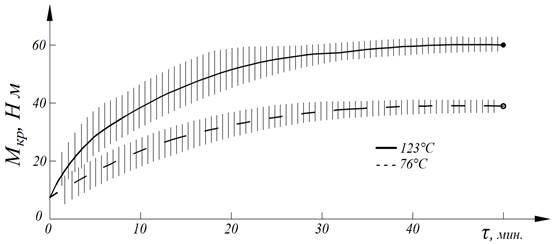 Рисунок 2. Кинетика изменения крутящего момента (Мкр) в поцессе смещения 40 мас.ч. Еленинского каолина (_____), модифицированный ГЛЕЖ (---) на 15 мас.ч. СКИ-3+15 мас.ч. СКН-26+70 мас.ч. СКС-30АРК