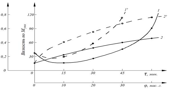 Рисунок 3. Зависимость вязкости по Муни (1,1ꞌ) и коэффициента клейкости (2,2ꞌ) резиновых смесей на основе 15% СКИ-3+15% СКН-26+70 СКМС-30 АРК (содержание каолина (2) и модифицированного ГЛЕЖ (2ꞌ) 40 мас.ч. на 100 мас.ч. каучуков)