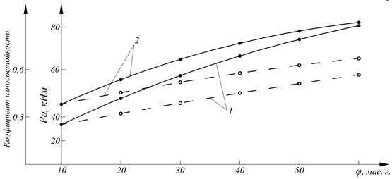 Рисунок 4. Зависимость влияния содержание модифицированного ГЛЕЖ (____) и Еленинского каолина (---) на разрывную прочность и износо-стойкость резин на аснове 15% СКИ-3 + 15% СКН-26 + СКМС-30 АРК