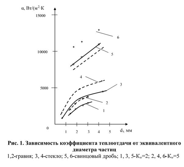 Одним из наиболее существенных факторов, влияющих на интенсивность теплообмена в кипящем слое, является диаметр частиц [1, 2, 3, 4]. Представления о влиянии размеров частиц на теплоотдачи имеют противоречивый характер. Например, в [5] указывается, что с увеличением диаметра зерен интенсивность теплообмена снижается. В [5, 6] наоборот отмечается, что коэффициент теплоотдачи выше в аппарате, где диаметр частиц больше.