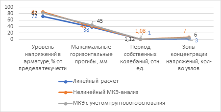 Результат. В ходе численного моделирования пространственного каркаса здания по методике конечных элементов были выявлены зоны максимальной концентрации главных напряжений в узлах сопряжения ригелей с колоннами первого яруса. Полученные результаты демонстрируют, что при расчетном сейсмическом воздействии уровень напряжений в арматуре достигает 85 % от предела текучести, при этом максимальные горизонтальные прогибы конструкции составляют 42 мм, что не превышает допустимые нормы КМК. Анализ деформированной схемы показал, что учет совместной работы фундамента с лессовым основанием увеличивает периоды собственных колебаний на 12 % по сравнению с жесткой заделкой опор. Количественная оценка напряженно-деформированного состояния подтверждает достаточный запас жесткости системы и адекватность принятых конструктивных параметров для эксплуатации в условиях сейсмичности 9 баллов.