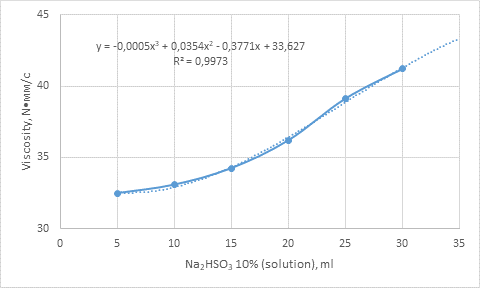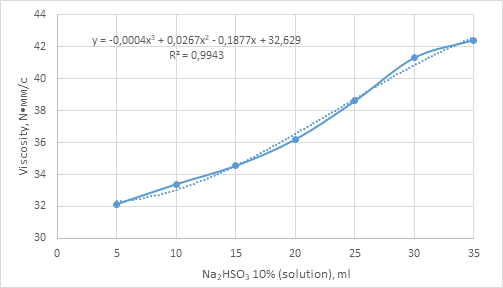 As seen from the graph, the viscosity increases with the rising amount of the binding agent, and under the effect of temperature, the growth in molecular size due to increased yield leads to a further increase in the viscosity of the reaction system.