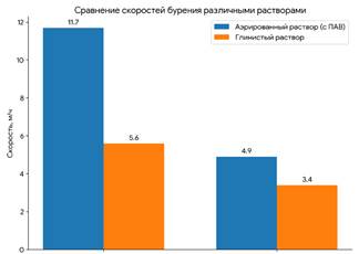 Анализ данных по скоростям бурения на трудной толще с применением аэрированных растворов и обычным методом (на глинистом растворе) продемонстрировал значительное технологическое преимущество аэрации. В ходе исследования было установлено, что скорость чистого бурения в аэрированных растворах составляет в среднем 11,7 м/ч (варьируясь в пределах от 9,4 до 14,2 м/ч), тогда как при обычном методе этот показатель равен 5,6 м/ч (от 5,1 до 5,9 м/ч). Таким образом, применение ПАВ и аэрации позволяет увеличить скорость чистого бурения в 2,1 раза. Средняя скорость бурения, рассчитанная с учетом сопутствующих работ и неизбежных простоев по техническим причинам, на аэрированных растворах составила 4,9 м/ч (от 4,8 до 5,7 м/ч) против 3,4 м/ч (от 0,8 до 5 м/ч) при использовании стандартного глинистого раствора, что показывает рост эффективности в 1,4 раза. Наглядное сравнение скоростей бурения представлено на Рисунке 1.