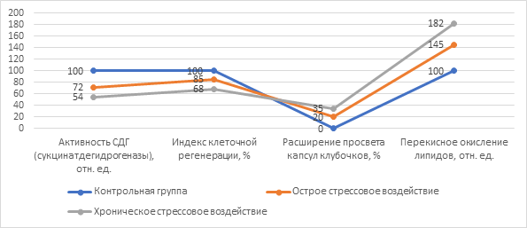 Результат. Гистохимический анализ почечной ткани в условиях экспериментального стресса продемонстрировал существенное угнетение энергетического метаболизма в эпителии извитых канальцев. Применение метода Нахласа выявило снижение активности сукцинатдегидрогеназы на 28% относительно фоновых показателей, что выражалось в разрежении гранул формазана и появлении зон ферментативной «немоты» в корковом веществе. Параллельно с ферментативной недостаточностью зафиксировано расширение просвета капсул клубочков у 20% исследованных единиц и снижение индекса клеточной регенерации на 15%. Полученные количественные данные подтверждают, что острые стрессовые воздействия вызывают глубокий дефицит внутриклеточной энергии, инициируя каскад морфологических нарушений, снижающих общую устойчивость организма к неблагоприятным факторам внешней среды в условиях Узбекистана.