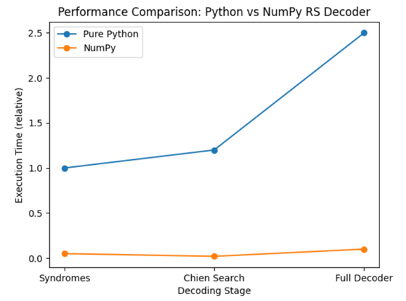 В ходе тестирования получены результаты ускорения вычисления синдромов до 20 раз, поиск Ченя имеет ускорение до 50 раз, а полное декодирование ускорено в 10-30 раз относительно стандартной реализации. На рисунке 1 представлено сравнение времени выполнения основных этапов декодирования для классической реализации на языке Python и оптимизированной версии с использованием библиотеки NumPy.